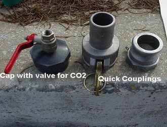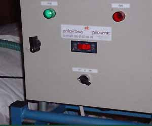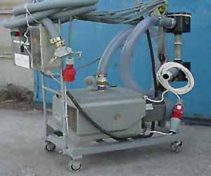 The next two pictures (below) show the Becker oil vacuum pump (left) used in the first trials in Israel. The two carbon filters can be clearly seen as well as the control panel. The picture on the right shows the quick connections used to link the storage cube to the pump, and the inlet valve for carbon dioxide flushing used in trials where combined vacuum and high carbon dioxide were employed.