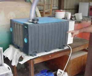 The first two pictures show the set-up during our initial trials on stored cocoa beans in Boston, Massachusetts. Here a Becker oil pump was used with two filters. Bioasseys of insects placed within the cube indicated succesful control at short exposure periods, but the range of low pressures under practical conditions and the durability of the pump under heavy-duty usage had to be further investigated. We found that water vapour released from the cocoa beans condensed and contaminated the oil of the pump during prolonged use to a point where the pump was no longer effective.