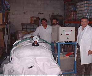 The next series of pictures were taken during two trials carried out in collaboration with a leading fumigation company in Israel in a food factory for packaging of semolina for baby food. Semolina, has a bulk density which makes it difficult for fumigant penetration, thereby leaving pockets of low fumigant concentration. Neither can semolina be seived to remove insects since the particle size of semolina is similar to that of insect eggs.
